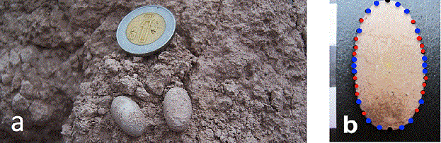 Color images of the specimens were captured using a Kodak EasyShare C195, with the same conditions of fixed focus, camera angle and magnification ratio. The scar marking the exit hole determined the orientation of the specimens; when it was not present, the traces of the scar were used. Two-dimensional (2D) geometric morphometrics (GM) were used to collect shape data. Two landmarks (Type 3, sensuBookstein, 1991) were positioned in the most exterior points of the rounded extremes of the specimens (point numbers 1 and 19), and 34 semilandmarks (point numbers 2 - 17 and 18 - 36) were positioned in the ellipse using a drawing fan generated by MakeFan8 (Sheets, 2010a) (Figure 1b). Two-dimensional coordinates of all the marks were digitized using tpsDig2 (Rohlf, 2013). Coordinates were imported into CoordGen 8 (Sheets, 2014a) to proceed to Procrustes superimposition followed by the semilandmark alignment with SemiLand 8 (Sheets, 2010b). The superimposition and alignment eliminated variation that was not due to form (translation, rotation and scaling). In the alignment, sixteen semilandmarks were used as helper points (4, 6 - 8, 12 - 14, 16, 22, 24 - 26, 30 - 32, and 34). Helper points were excluded from subsequent analysis, resulting in the reduction of the final variables number to two landmarks and 18 semi-landmarks.