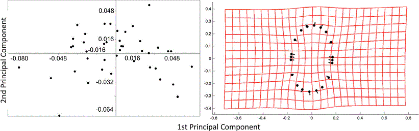 PCA analysis explains 78% of the variance in the first two axes, 50% in the first principal component and 28% in the second principal component (Figure 2a). The deformation grid over the two principal components shows a deformation along the ellipse’s contour, making some of them elongated and thinner, while others were shorter and wider (Figure 2b).