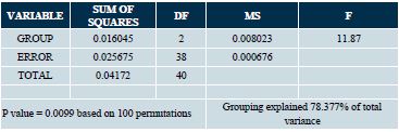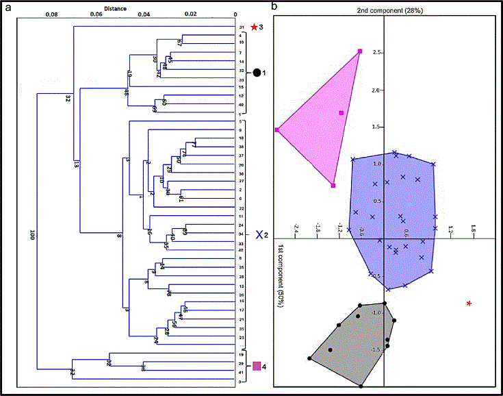 Cluster analyses with UPGMA formed four groups, three of them were segregated in the first principal component and the fourth one could be seen over the second component represented by only one individual (Figure 3). Although UPGMA analysis suggested four groups, CVA analysis was done with three of them (1, 2 and 4 in Figure 3) because of the lack of variance in the group number 3, composed of only one specimen (Figure 4). In Figure 4, the CVA analyses showed two significant distinct CVA axes on which the three morphs are clearly differentiated (Table 1). MANOVA analysis suggests that 78.4% (p < 0.001) of the variance is explained by the morph groups’ differences (Table 2).