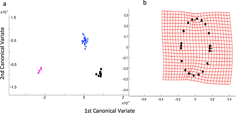 A Principal Component Analysis (PCA) was performed with PCAGen (Sheets, 2014b) with the aim to explore the shape variation across individuals. Procrustes distances were calculated as a measure of total similarity among shapes; the matrix with pairwise distances was imported into the software PAST (Hammer et al., 2001) for cluster analyses and the Unweighted Pair Group Method with Arithmetic Mean (UPGMA) and hierarchical grouping algorithm was used. Resulting clusters were analyzed with Canonical Variates Analysis (CVA) using CVAGen 8 (Sheets, 2010c) to estimate a MANOVA (Multivariate analysis of variance) for the differences in shape among groups.