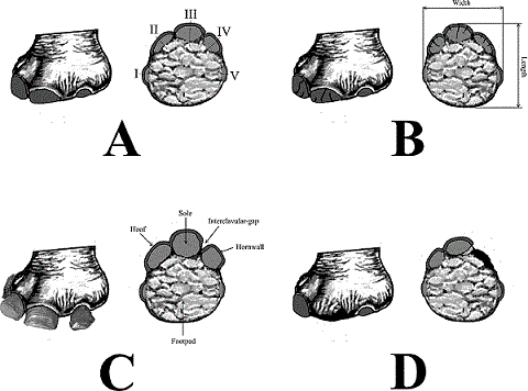 McCrea et al. (2015) proposed five categories of primary factors causative of pathologies, with the potential of affecting firstly the foot morphology, and ultimately the locomotory function of an animal: (1) congenital abnormalities, (2) biomechanical injuries, (3) brain or spinal lesions, (4) sicknesses, and (5) age-related problems. The described diseases would be caused by the fourth group.