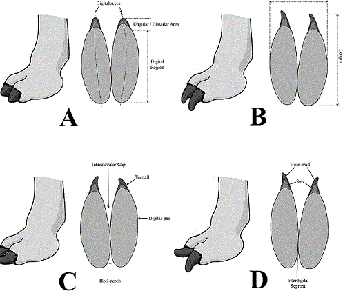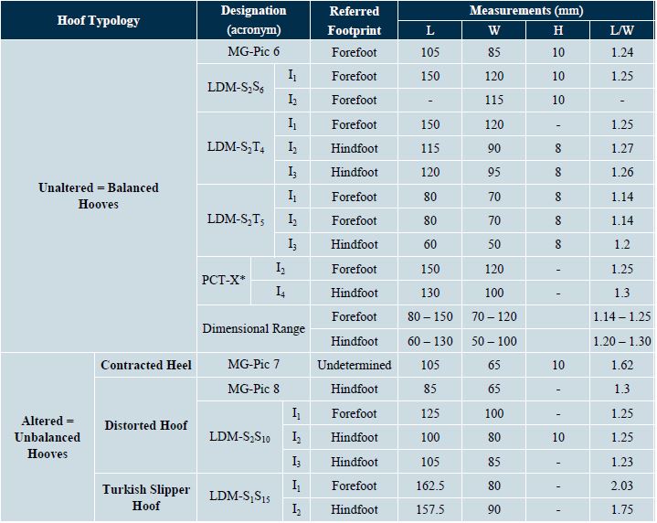 As previously discussed, most of these features are also subject to intraspecific variations of teratologic order, as well as the overall footprint measurements (length, width, length/width ratio). Therefore, it is advisable to restrict its use only to unaltered hoofprints (non-pathological tracks).
