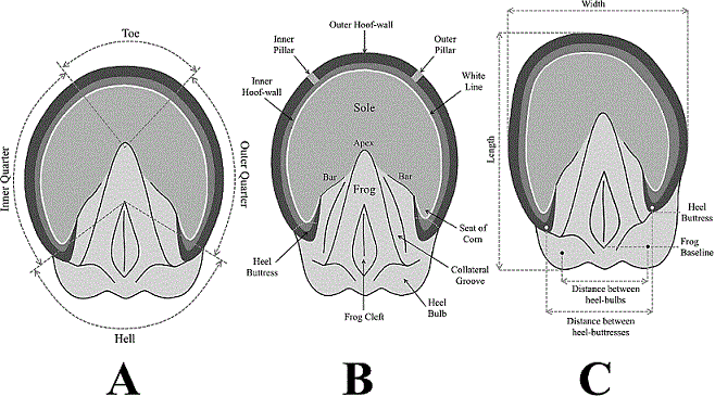 The normal or balanced equine hooves (unaltered autopodes) are almost bisymmetric and present transversely aligned heel buttresses, disposed approximately at the same level as the frog baseline and heel bulbs (Figure 5A).