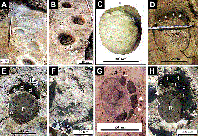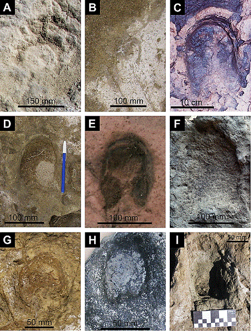 Unaltered footprints. Constitute large and deeply imprinted paleoichnites of roughly circular/ovoidal outline, which are bilaterally symmetrical, almost isodiametrical and usually surrounded by a noticeable annular ridge (marginal rim) (Figure 6A-F).