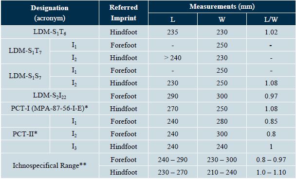 Forefoot and rearfoot imprints exhibit the same morphostructural pattern, only differentiating through their dimensions and proportions (slight heteropody). In this regard, the manus (length: 80 - 150 mm; width: 70 - 120 mm; length/width ratio: 1.14 - 1.25) is comparatively larger and proportionally longer than the pes (length: 60 - 130 mm; width: 50 - 100 mm; length/width ratio: 1.20 - 1.30) (Table 4).