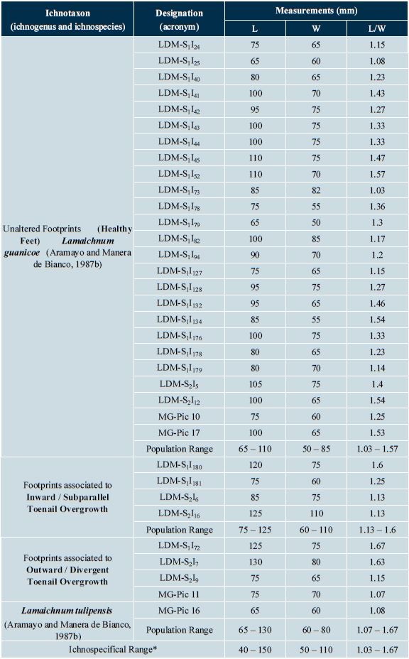 More precisely, the new available evidence indicates that the ichnotaxobases established to differentiate Megalamaichnum tulipensis from Lamaichnum guanicoe (and the ichnogenera that they typify) (see Aramayo and Manera de Bianco, 1987b, 1996; Aramayo et al., 2015) represent signs of outward/divergent toenail overgrowth in living llamoids (falling within the range of intraspecific variation of an unique species) that should not be interpreted as differences of ichnotaxonomical order.