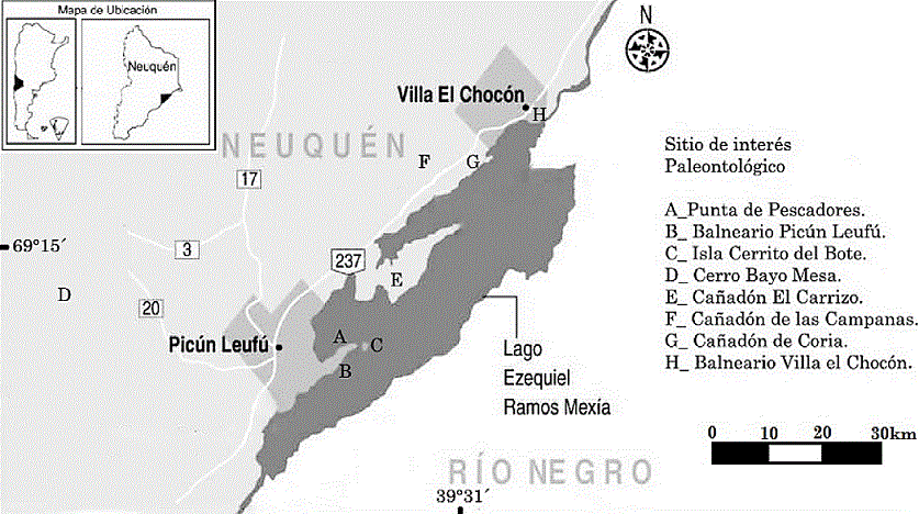 El embalse Ezequiel Ramos Mexía, Provincia de Neuquén, Patagonia, Argentina, ha dado en los últimos 30 años una riquísima fauna de vertebrados mesozoicos continentales (Figura 1). Si bien se conoce la existencia de huellas desde 1979 en los alrededores, el primer informe inédito fue realizado a finales de la década del 70 (Gasparini y Musacchio, 1979). Los primeros datos publicados sobre huellas de dinosaurios en la región son mencionados por Leonardi (1981) sin realizar ningún tipo de diagnosis ni descripciones detalladas. Los primeros estudios de icnitas se restringieron al área suroccidental del embalse, en la Península Nueva e Isla Cerrito del Bote en la localidad de Picún Leufú (Calvo, 1989, 1991). Posteriormente, se descubrieron nuevas huellas en distintos sectores de la costa oeste del embalse cuyos sitios fueron dados a conocer como Cañadón Carrizo, Cañadón de las Campanas, Punta de Pescadores, Cañadón de Coria y Balneario Villa El Chocón en la Provincia de Neuquén (Calvo et al., 1989) y en la costa este del embalse, en la Provincia de Río Negro en el sitio denominado El Gigante (Calvo et al., 2000). A pesar de estos hallazgos, no se realizó ningún estudio sistemático de las huellas descubiertas, excepto el de Península Nueva (Calvo, 1991, 1999). En años recientes, nuevos trabajos de icnitas de dinosaurios en la costa occidental del embalse, con redescripciones de las icnoespecies, se llevaron a cabo por diversos investigadores (Leonardi, 1994; Calvo y Coria, 1995; Calvo y Salgado, 1995; Calvo, 1999, 2007; Mazzetta y Blanco, 2001; Calvo y Vejsbergj, 2003; Calvo y Mazzetta, 2004; Krapovickas, 2010; Rivera y Calvo, 2016). En este trabajo presentamos una actualización de todos los sitios y trabajos publicados sobre huellas de dinosaurios en la costa oeste del embalse Ezequiel Ramos Mexía, se asignaron las huellas a las icnoespecies ya conocidas y se aportó nueva información sobre las mismas. Se presentan fotos y tablas con medidas nunca antes publicadas de los icnotipos y otros sitios para mayor referencia. Se mencionan las icnoespecies válidas y se define una nueva icnoforma para el Cerro Mesa y la Isla Cerrito del Bote. Se establece un nuevo neotipo con diagnosis mejorada para Deferrariischnium mapuchensis.