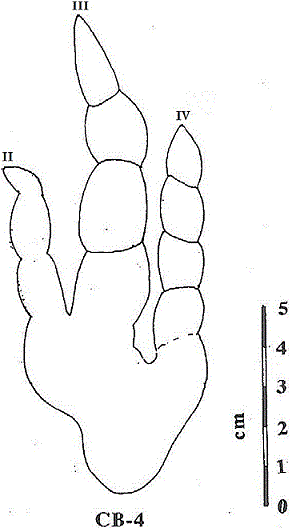 Se trata de un par de huellas de un dinosaurio carnívoro de gran tamaño (CB-7) con rumbo 55° (plastotipo MUCPv-139), con un paso de 146 cm. Las huellas bien conservadas tienen 47 cm de largo por 42 cm de ancho. Las huellas son tridáctilas con presencia de garras en los extremos de los dedos (Figura 7; Calvo y Mazzetta, 2004). El dedo III es el más largo de todos. El dedo II es más corto que el IV y ambos presentan poderosas impresiones de garras desplazadas hacia afuera. La divergencia entre los dedos es de un ángulo bajo. El talón es pequeño y de borde subredondeado.