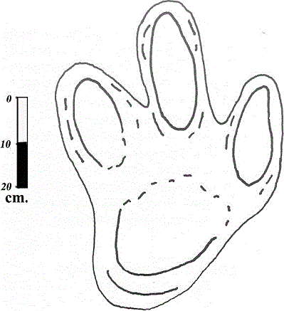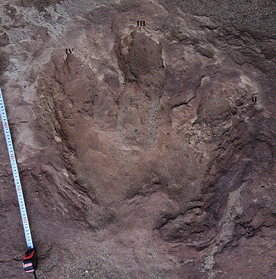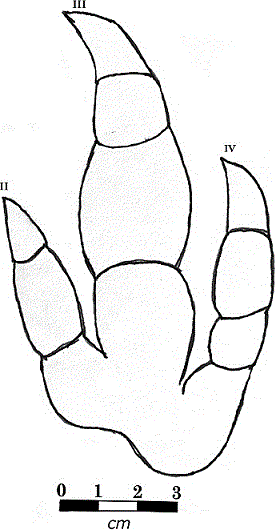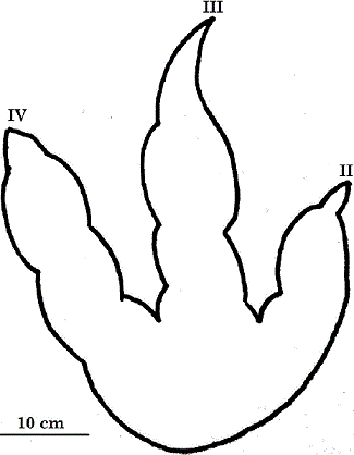 Tiene una longitud de 26 cm y una anchura de 29 cm. Son tridáctilas con presencia de marca de garras en los extremos de los dedos. La impronta del talón es de contorno subredondeado.