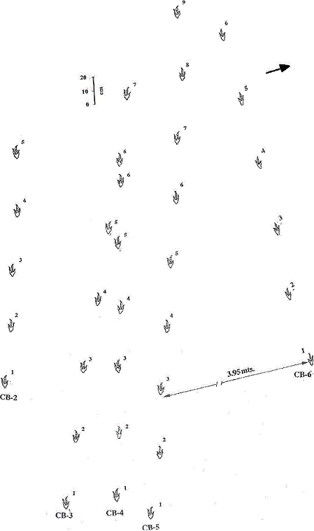 Pista de dinosaurio cuadrúpedo de 6 m de longitud y 12 huellas impresas con una pobre morfología de detalle en los dedos (CB-1) (Figura 14). El eje de la pista pasa a unos 15 cm del borde póstero-ventral de las huellas traseras. El ángulo de paso de las huellas delanteras oscila entre 75 y 95° y el de las huellas traseras entre 100 y 120°, respectivamente. El ancho externo es de 1.4 m, y el interno de 0.6 m. El largo de paso oscila entre 2 y 2.2 m (Calvo y Mazzetta, 2004). Las huellas traseras son más grandes que las delanteras y tienen una forma subtriangular de 70 cm de largo por 60 cm de ancho, sin detalle de separación entre dedos y talón. Las huellas delanteras son de forma arriñonada, levemente cóncavas en la parte posterior. Tienen 25 cm de largo por 40 cm de ancho.
