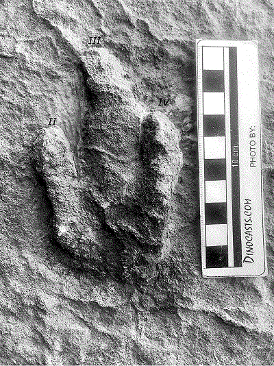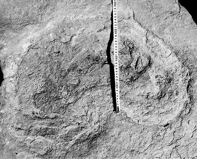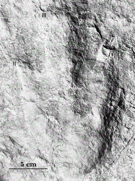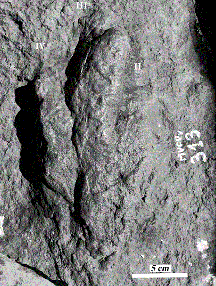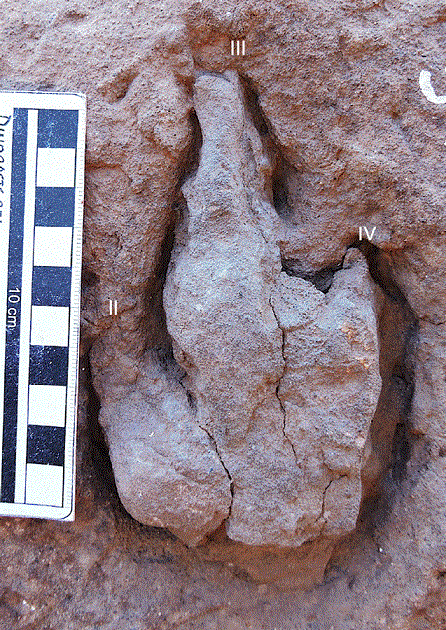 Sousaichnium monettae. Plastotipo, MUCPv71. Una huella izquierda en molde e in situ.