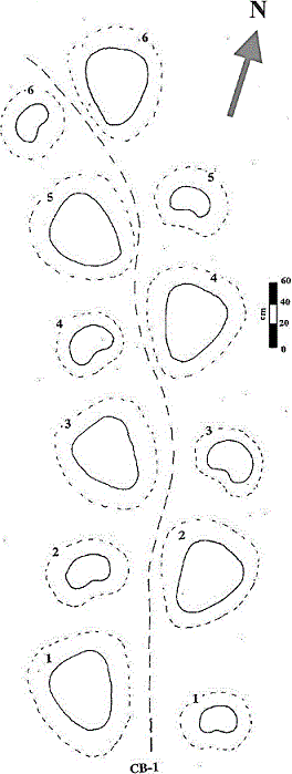 Se reconocen 7 pistas con las siglas CB 1 a 7 (Calvo y Mazzetta, 2004). Las pistas CB 1 a 6 fueron halladas en la misma superficie, mientras que la pista CB-7 se encuentra en niveles superiores. La secuencia local corresponde a una intercalación de areniscas y pelitas (Figura 46). En el nivel 1 se han detectado cinco pistas, cuatro de las cuales corresponden a dinosaurios terópodos (CB-2 a CB-6) y una a un dinosaurio saurópodo (CB-1). En el nivel 2 hay sólo una huella de un gran terópodo (CB-7).