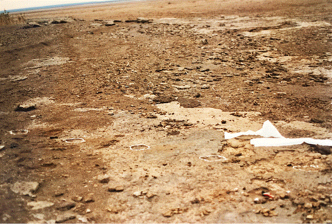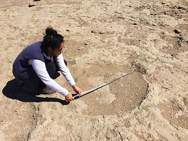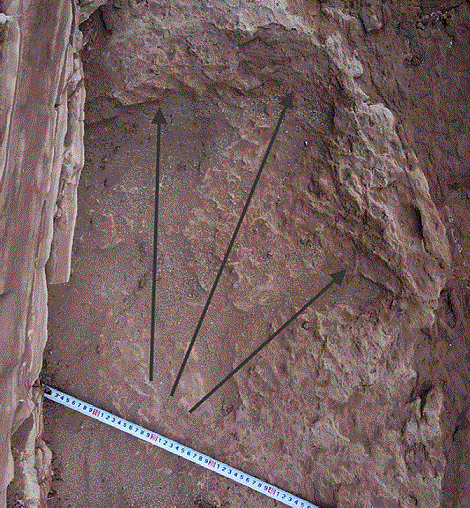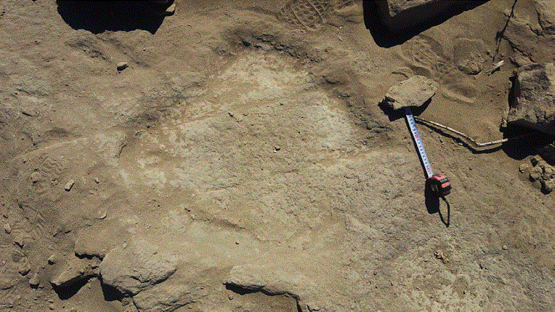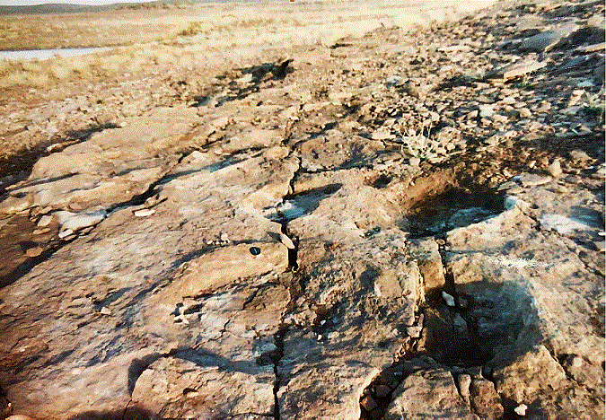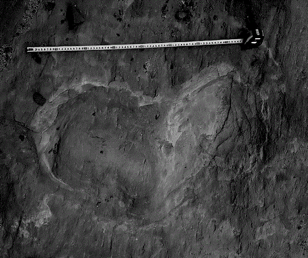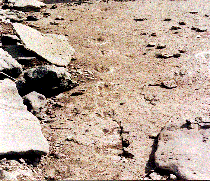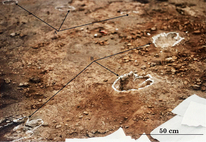 Sauropodichnus giganteus. Holotipo in situ. Registro fotográfico MUCPv 145 y 146. Se identificaron dos pistas con 15 huellas en total.