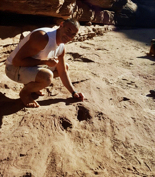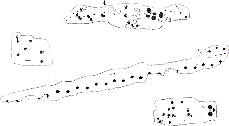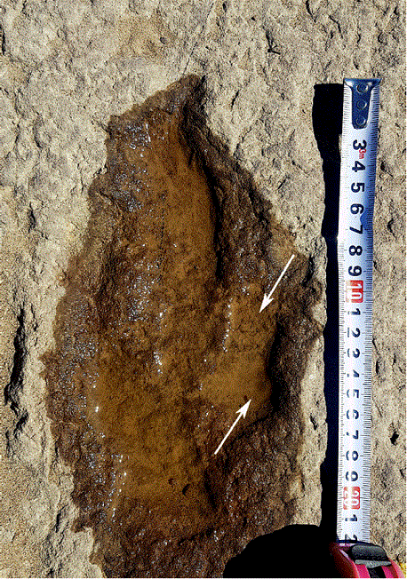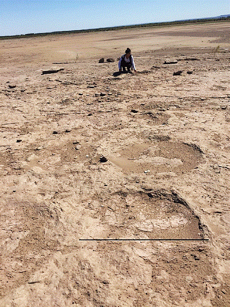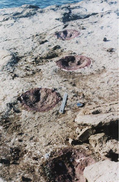 En este sector abundan huellas de saurópodos pero la mayoría corresponden a siluetas o están muy erosionadas. Son de destacar las manos delanteras de los saurópodos que tienen la forma característica de riñón con tamaños que rondan los 80 cm de ancho por 40 cm de largo (Figura 55). Esta forma es muy particular y ya ha sido registrada en Isla Cerrito del Bote y en Península Nueva, en la localidad de Picún Leufú.