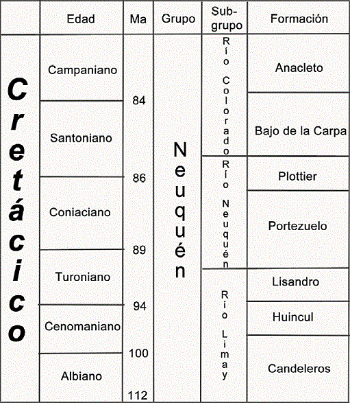 La Cuenca Neuquina es una enorme depresión con depósitos marinos y continentales superpuestos de más de 7000 m de potencia y depositados durante el Jurásico y Cretácico (Zavala, 2005). En los términos superiores de la misma se desarrolla el Grupo Neuquén, una secuencia de rocas sedimentarias clásticas de origen continental (Cazau y Uliana, 1973; Ramos, 1981; Uliana y Dellapé, 1981). El Grupo Neuquén incluye tres subgrupos: de abajo hacia arriba, Río Limay, Río Neuquén y Río Colorado (Figura 2). En la base del Subgrupo Río Limay se encuentra la Formación Candeleros, que es la portadora de las huellas de dinosaurios del presente estudio. La antiguedad de la Formación Candeleros es Albiano-Cenomaniano tal como fue propuesta por Calvo (1989; 1991) basada en huellas de dinosaurios. Fue confirmada utilizando, en la base del Grupo Neuquén, datos de antigüedad U/Pb de los detritus de zircón (100 Ma; Fennell et al., 2017). También con base en las discontinuidades estratigráficas (Asurmendi et al., 2017). La Formación Candeleros es muy extensa en la Cuenca Neuquina, por lo que ha sido objeto tanto de estudios generales como de detalle; es por ello que ha dado lugar a interpretaciones variadas de su geología y ambiente de depositación (Roll, 1939; Herrero-Ducloux, 1946; Di Paola y Marchese, 1970; Marchese, 1971; Digregorio, 1972; Cazau y Uliana, 1973; Di Paola, 1973; Ramos, 1981; Uliana y Dellapé, 1981; Spalletti y Gazzera, 1989; Gazzera y Spalletti, 1990; Leanza y Hugo, 1995, 1997, 2001; Ardolino et al., 1996; Leanza, 1999; Hugo y Leanza, 2001; Leanza et al., 2001; Sánchez et al., 2004; Garrido, 2010).