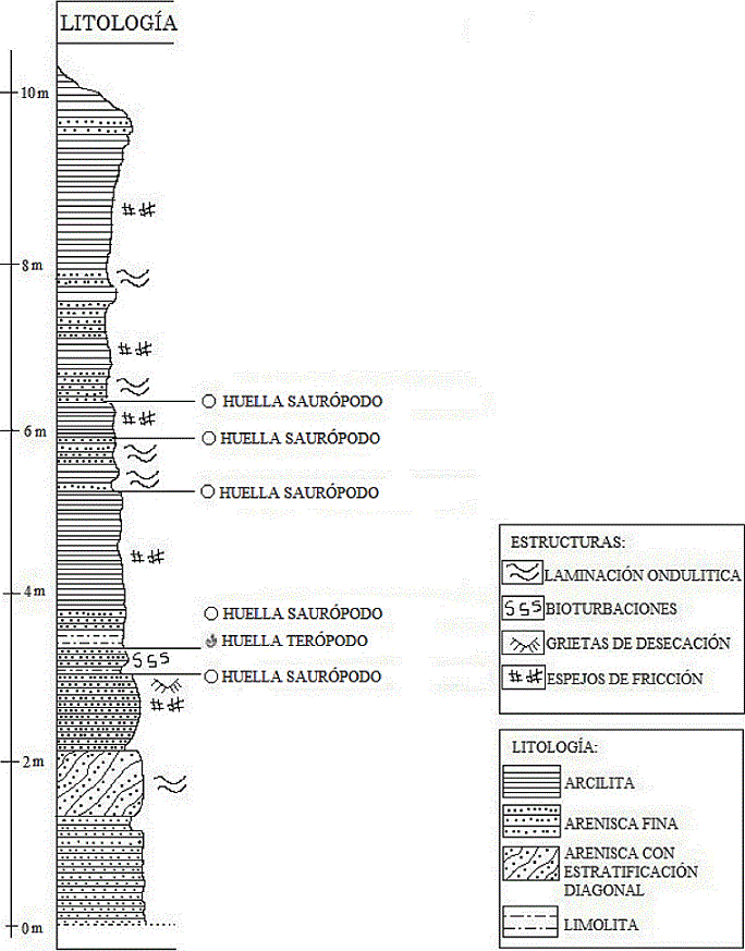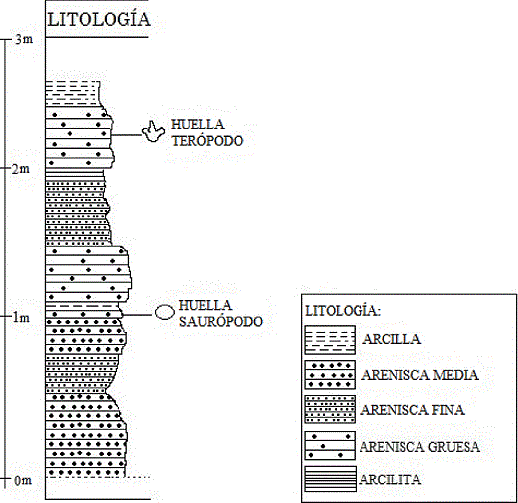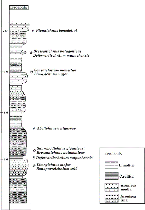 Como se describió en el trabajo original (Calvo, 1991), las pistas de dinosaurios se hallaron en 5 niveles diferentes (Figura 20). La coexistencia de dinosaurios ornitópodos, saurópodos y terópodos en un mismo nivel se repite en los distintos estratos que conservan las huellas. Recientes trabajos de campo realizados durante el 2016 y 2017, tanto en la costa norte como en la costa este de la Punta de Pescadores, han dado como resultado el hallazgo de nuevos materiales icnológicos con huellas in situ y moldes naturales. Seguidamente describimos los nuevos registros que se asignaron a las formas conocidas hasta la fecha. Durante el 2016 y 2017 se realizaron viajes de campo a la Península Nueva y se revisaron colecciones antiguas depositadas en el Museo de Geología y Paleontología de la Universidad Nacional del Comahue. Los estudios de campo permitieron hallar nuevos materiales y realizar una columna estratigráfica nueva (Figura 21). Un estudio preliminar permitió identificar, en el sector este de la península, nuevos materiales que permitieron interpretar los paleoambientes como sistemas meandrosos de baja energía que desembocaban en lagunas someras (Rivera y Calvo, 2016).