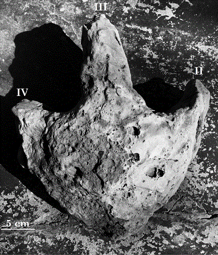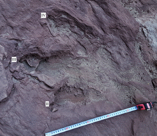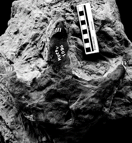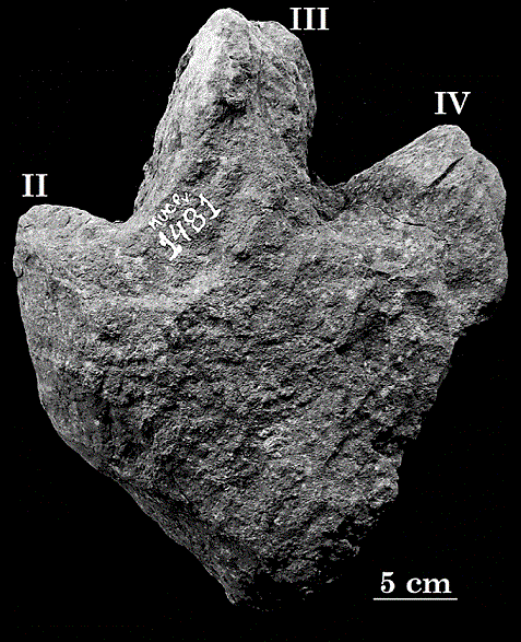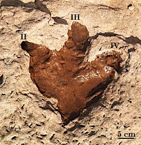 MUCPv-972 (Figura 29): huella producida por un dinosaurio bípedo tridáctilo de talla mediana. Tiene una longitud de 38 cm y una anchura de 28.5 cm. El dedo III es más largo que sus laterales. La impronta del talón es pequeña y subredondeada.