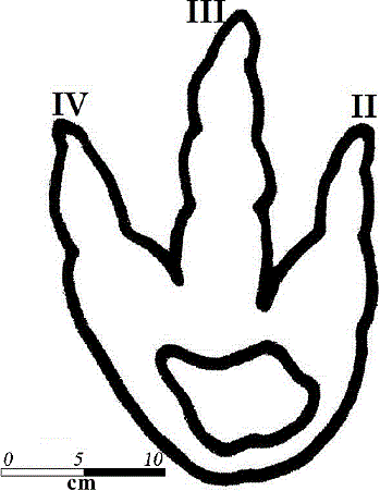MUCPv-313: producida por un dinosaurio bípedo tridáctilo de talla pequeña (Figura 33; Tabla 11). La misma está representada por una longitud de 20 cm y 10.5 cm de anchura. El largo está representado, en su mayoría, por el dedo III que a su vez es más largo y robusto que sus laterales. El dedo II muestra las falanges gruesas y cortas y su impresión de garra, el dedo III presenta las tres falanges con poca impresión de la garra, mientras que el dedo IV no permite diferenciar las falanges. La impronta del talón es pequeña.