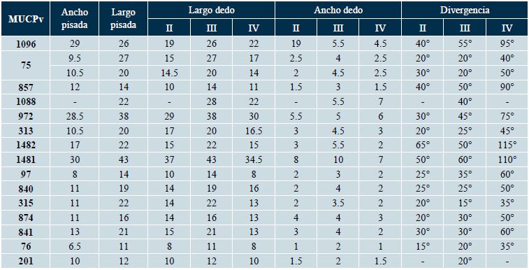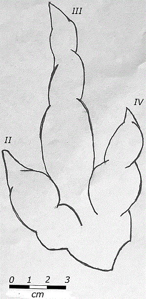 Descripción. MUCPv-97 tiene 15 cm de largo y 7.5 cm de ancho (Tabla 11). El talón está prácticamente completo pero la parte faltante se puede inferir a partir del material original. El dígito III con 125 mm es el más largo, el dedo II tiene 60 mm y el dedo IV posee 75 mm. La segunda falange del dedo III es gruesa y larga como también la primera falange del dedo II. El dedo IV no se encuentra con buen detalle de falanges. El talón es agudo, está desplazado hacia el exterior y es muy pequeño.