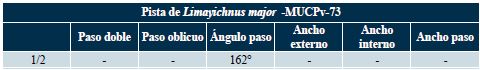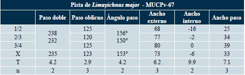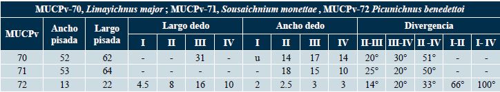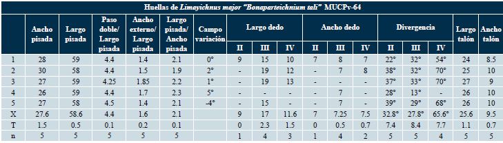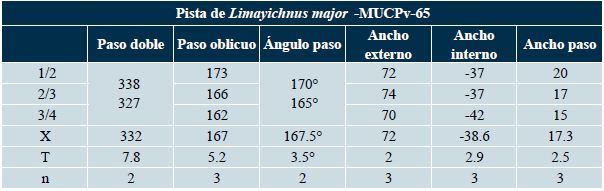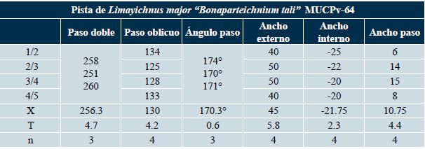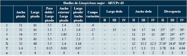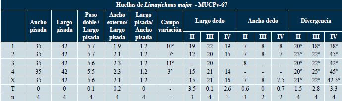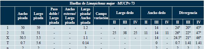 Limayichnus major. Plastotipo, MUCPv-65; plastohipodigma, MUCPv-64 y 67 (Figura 18), 70 y 73. Se identificaron seis pistas con 17 huellas en total.