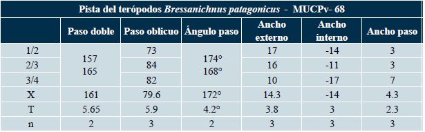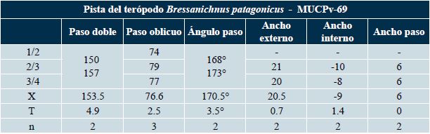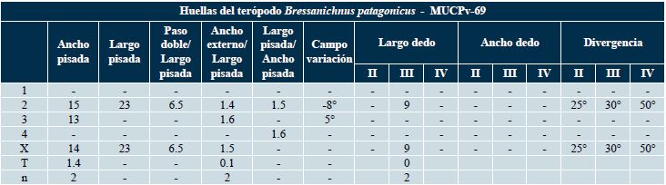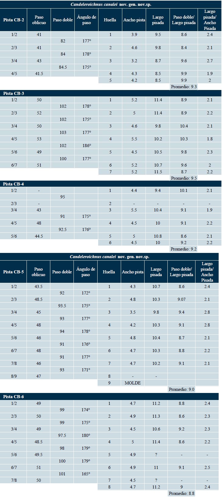 Ver detalle en la descripción de la icnoespecie Candeleroichnus canalei (Figura 10). Calvo y Mazzetta (2004) describieron 5 pistas atribuibles a esta icnoespecie con un total de 34 huellas de 10 cm de largo de promedio y 5 cm de ancho, en donde el 80% lo ocupan los dedos (Figura 12). Las pistas son extremadamente estrechas y rectilíneas, con un ángulo de paso que oscila entre 175 y 180°. Las mismas se dirigen al este o este-sudeste, con los siguientes rumbos y detalles: