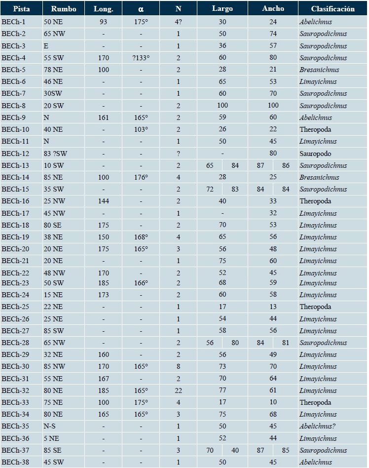Las huellas y pistas BECh 6, 11, 17, 18, 19, 20, 21, 22, 23 (Calco MUCPv-83) (Figura 57), 24 (Calco MUCPv-84), 26, 27, 29, 30, 31, 32, 34 y 36 se corresponden con las de animales bípedos, tridáctilos y con un ángulo de paso elevado (Figura 56). Las huellas se caracterizan por ser masivas casi simétricas sin evidencia de uñas o talón. Los dedos son cortos y gruesos; el dedo III es el más largo y diverge muy poco de los laterales. El borde posterior de la huella es redondeado. Éstas son atribuidas a ornitópodos iguanodóntidos. En las pistas BECh 6, 19, 20, 21, 22, 23, 24, 27, 29, 31, 32 y 34 el dedo III preserva la impresión de las almohadillas plantares de forma ovalada. Datos de huellas y pistas muestran que la mayoría de los ejemplares eran adultos y se desplazaban principalmente con dirección suroeste-noreste. La morfología de detalle, de las huellas, se corresponden perfectamente con aquellas descritas para la localidad de Picún Leufú y que son asignadas a Limayichnus major (Calvo, 1991). Para las pistas BECh 30, 32 y 34 el ángulo de paso es de 165o.