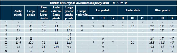 Comparaciones. Si bien se realizaron comparaciones de estas huellas con otras conocidas (Calvo y Mazzetta, 2004), las mismas no se pudieron diagnosticar en su momento ya que son huellas muy conservadoras y presentes en muchos grupos de vertebrados. Por ejemplo, hay grandes similitudes con Grallator (Hitchcock, 1858) del Triásico MedioJurásico Inferior y Triásico Superior (Conrad et al., 1987) en tamaño, forma, relación entre paso doble y largo de pisada y posición de los dedos; sin embargo, hay diferencias en la impresión de la palma. Con Anchisauripus hitchcockiLull (1904) tiene algunas similitudes en el aspecto general, pero se diferencia de esta especie por tener impresión de la garra del dedo I y un ángulo de paso mayor, no presente en el icnogénero neuquino. Con las formas neuquinas se las comparó con Deferrariischnium mapuchensis indicando similitudes pero también diferencias. Por ejemplo, en este icnogénero varía la simetría y el tamaño de esas huellas, mientras que los dedos laterales no muestran impresión de garras y divergen del central con un ángulo mucho mayor que el material aquí comunicado, por lo que no fue asignado a esta icnoespecie (Calvo y Mazzetta, 2004). Se observa además cierto parecido con Coelurosaurichnus (Conrad et al., 1987), pero hay diferencias en el ángulo de paso, impresión del talón, ángulo interdigital mayor, relación paso doble/largo de pisada menor, etc., por lo que no se asignó a ese icnogénero. No se correspondería tampoco con icnotaxones de la Icnofamilia Dromaeopodidae los cuales presentan impresiones de dos o tres dígitos y marcas de garras (Li et al., 2008) o como las asignadas a dromaeosáuridos de Toro Toro en Bolivia (Apesteguía et al., 2011). Desde su primera publicación hasta el presente, este sitio ha sido el más abundante en calidad y cantidad de huellas de dinosaurios (Calvo, 1989, 1999; Calvo y Mazzetta, 2004; Rivera y Calvo, 2016). Han pasado 28 años y huellas similares han sido detectadas en forma aislada en distintas partes de la costa del embalse. Por otro lado, las decenas de restos de vertebrados fósiles que han sido estudiados nos hablan de una icnofauna muy particular para la base de la Formación Candeleros (Cretácico Inferior alto-Cretácico Superior bajo). Si bien hay formas similares a este patrón de icnitas, la nueva icnoforma que se describe muestra una morfología particular, lo que valida su designación con un nombre genérico. Estas huellas completan la fauna de terópodos de pequeño tamaño registrados en la Formación Candeleros, lo cual indica que la fauna estaba compuesta por numerosas especies de dinosaurios carnívoros de variadas formas y tamaños asociadas a dinosaurios ornitópodos y saurópodos.