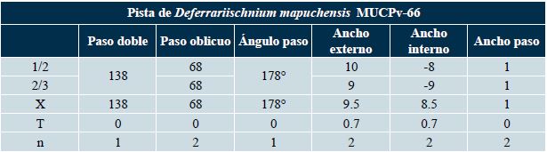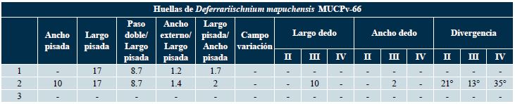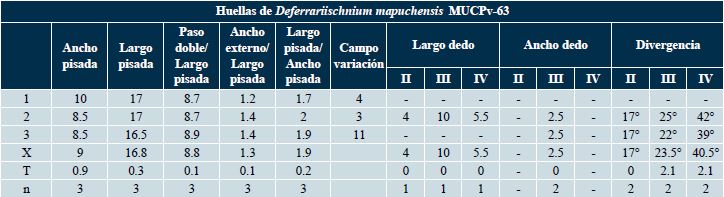 Neotipo. MUCPv-97. Se ha detectado en las colecciones del Museo de Geología y Paleontología de la Universidad Nacional del Comahue una huella original proveniente del sitio Punta de Pescadores que corresponde a la icnoespecie Deferrariischnium mapuchensisCalvo, 1991 lo que nos permitió enmendar la diagnosis original de la especie (Figuras 6 y 7; Tabla 11). Si bien se había descripto la pista como holoplastotipo (Calvo, 1991), el hallazgo de material original (MUCPv97) y más detalles morfológicos permiten definir a este material como nuevo holotipo de esta icnoespecie.