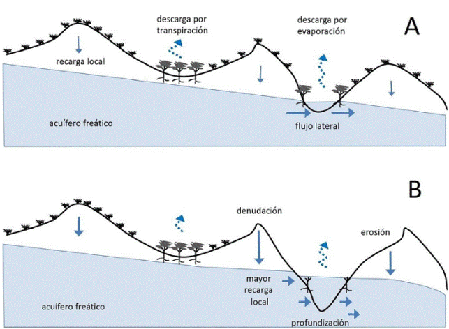 Cabe preguntarse cómo es posible que en un paisaje de llanura y clima semiárido en el cual la evaporación a la atmósfera supera ampliamente a los aportes de la precipitación, pueda encontrarse agua libre permanente y dulce, especialmente a gran distancia de los cordones montañosos andinos. Concurren aquí tres aspectos naturales de los paisajes de dunas: (a) la gran permeabilidad de los materiales arenosos (Hillel, 1998) y la dificultad que encuentran las raíces de las plantas para hacer un uso exhaustivo del agua en ellos (Sperry et al., 1998), lo cual lleva a que una fracción de las lluvias alcance el manto freático. Aun cuando escaso, este flujo es apreciable y se detecta en condiciones climáticas muy áridas, por ejemplo, en el campo de dunas de Telteca, con sólo 150 mm/año de precipitación (Jobbágy et al., 2011). (b) Esta capacidad de recarga freática, combinada con la disposición regionalmente plana pero localmente ondulada del paisaje, lleva a que en los puntos más bajos el agua se acerque a la superficie. Una gran área de recarga (esencialmente todo el campo de dunas) y un área de evaporación pequeña (solo las zonas de lagunas y los bajos con vegetación que acceden a la capa freática) permiten que el sistema mantenga su balance. (c) La existencia de flujo horizontal subterráneo de agua, favorecido por la alta conducción del material arenoso, permite que los cuerpos de agua no se salinicen indefinidamente por evaporación y mantengan una composición dulce relativamente estable (Figura 4).