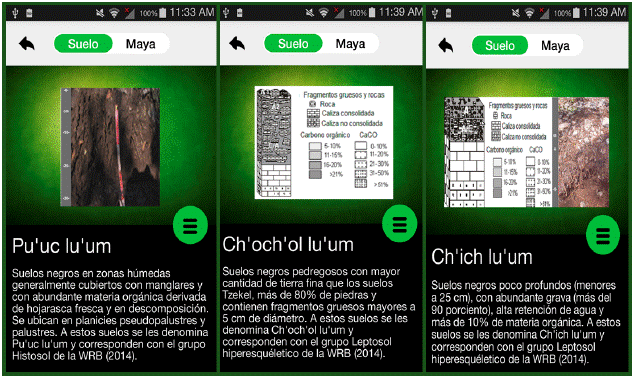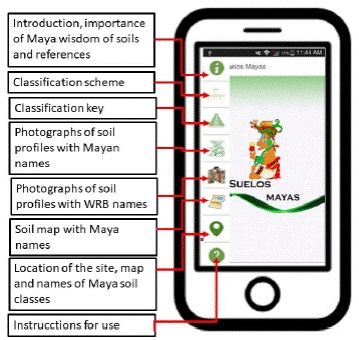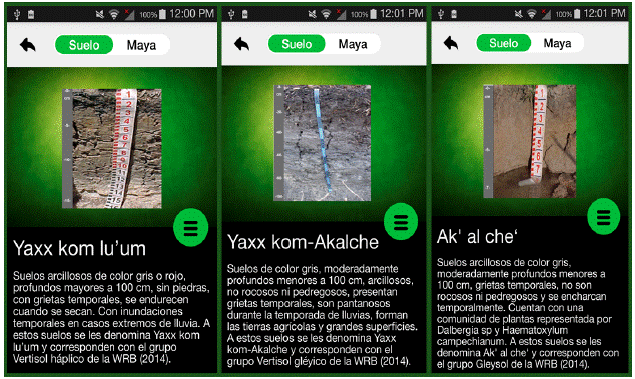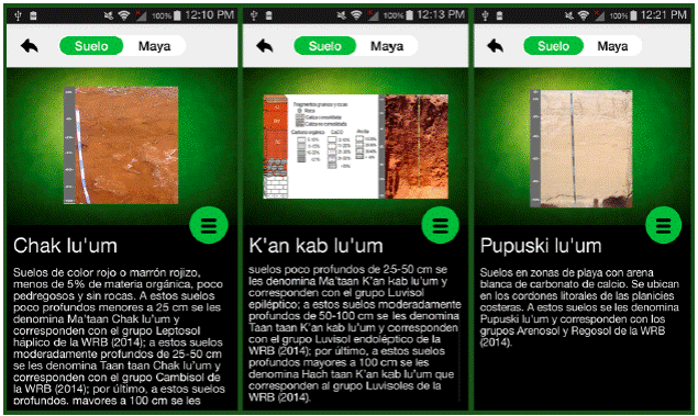 Abstract: The Maya knowledge of soils has overcome the mistrust of soil scientist towards local and indigenous knowledge because it is a classification system with hierarchically organized concepts. With the aim of popularizing and improving Maya soil knowledge, we developed the Maya soil classification app. The app includes the description of Maya soil classes and of three Maya ecological terms (Petén, Kankabal, and A’kalche’) that associate the physical and biotic environments. The app includes photographs of soil profiles with their corresponding Maya terms and international classifications, along with a Maya soil classification map of the Mexican state of Yucatán showing the geographical location of Maya soil classes. Trough GPS services, the user can identify in the app the associations within local Maya soil classes. In this article we describe the structure and function of the app.