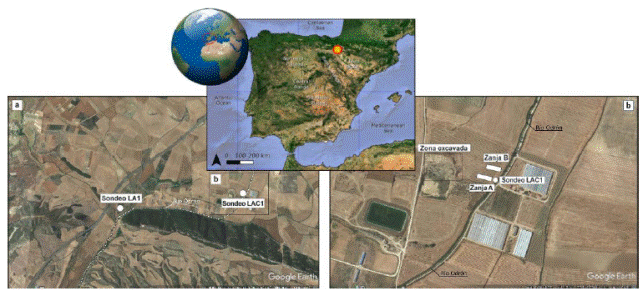 Para ello se realizaron 2 sondeos y 2 excavaciones mecánicas (zanjas) en las márgenes del río Odrón (Figura 1). Tanto las dos zanjas (Figura 1A y 1B) como uno de los sondeos (LAC1) se realizaron dentro del área del yacimiento, a orillas del río Odrón. El sondeo LA1, sin embargo, se realizó 2.5 km aguas abajo de los anteriores, en una amplia depresión fácilmente inundable en el cauce del río Odrón (LA1 en Figura 1). Todos los sondeos y excavaciones permitieron recuperar secuencias sedimentarias holocenas en las que se abarcan las cronologías neolíticas de ocupación del yacimiento (ca. VI milenio A.C.).