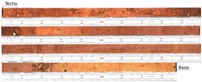 Unidad 3. Sedimentos coluviales: Entre el techo de la secuencia y 117 cm de profundidad se extienden limos arenosos de color más amarillento y aspecto compacto y menos plástico que las arcillas subyacentes (figuras 2 y 3d). Incorpora gravas dispersas de tamaño centimétrico. Incluye en la base (entre 90 y 110 cm de profundidad) un nivel semejante a las arcillas rojas inferiores, con fragmentos de carbón. Presenta niveles con precipitados de yeso, si bien éste está presente de manera dispersa a lo largo de todo su espesor, excepto en el intervalo basal previamente indicado.