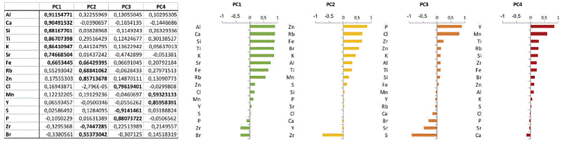 El análisis geoquímico y el tratamiento estadístico mediante ACP de los datos obtenidos, permiten corroborar la estratigrafía antes descrita e inferir distintos procesos sedimentarios reflejados en los componentes principales diferenciados (Figura 4).