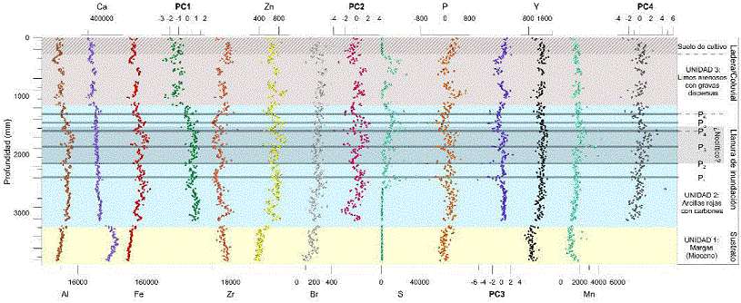 Durante la Unidad 2, aproximadamente la primera mitad del Holoceno, la constatación de facies de canal lateralmente equivalentes a limos orgánicos de llanura de inundación, indica la presencia de un sistema fluvial de energía media/baja y perfil longitudinal de pendiente relativamente baja. El pequeño espesor de las gravas y arenas de la secuencia de relleno de canal indica la presencia de canales relativamente poco profundos (ca. de 30‒50 cm), anchuras inferiores a la decena de metros y energía moderada, dado que las gravas centimétricas no son abundantes. Dichos canales podrían ser de geometrías meandriformes, con canales que migrarían lateralmente en un fondo de valle vegetado, rellenos de secuencias de canal amalgamadas, que denotan eventos de crecidas moderadas, y flanqueados por ambientes de llanura de inundación estables en el tiempo. En las arcillas de llanura de inundación es posible acotar distintos eventos de inundación gracias al reconocimiento de hasta 6 ciclos de paleosuelos agradantes (P1 a P6 en Figura 5). Así, una inundación supondría la adición de sedimento arcilloso (PC1), caracterizados por una posterior incorporación de material orgánico, posiblemente debido a la edafización y colonización por cobertera vegetal (PC2) del área de llanura de inundación. Posteriormente, se detecta la precipitación de yeso (S) en la porosidad de la zona superficial de cada evento de inundación o paleosuperficie, debido a la evaporación del agua intersticial al quedar expuesto subaéreamente (PC3). Cabe señalar la presencia dentro de la Unidad 2, entre 150 cm y 217 cm de profundidad, de un intervalo relativamente rico en Mn e Y (PC4) que podría indicar la mayor presencia de carbón disperso y alteración antrópica de los sedimentos (¿arado y cultivo?); este intervalo coincide con la aparición de abundantes fragmentos de carbón disperso en el sedimento en una posición estratigráfica correlacionable a la de las hogueras encontradas en la Zanja A y que potencialmente representarían el lapso cronológico de la Fase III (Neolítico Final-Calcolítico) de ocupación del yacimiento.