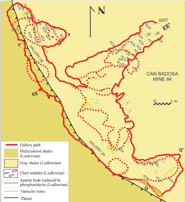 The site of mine 84 is at the Can Badosa neighborhood at the lower part of the Les Ferreres range, NW of Gavà. The mine has a relatively simple structure and consists of an exploration gallery (labeled gallery A in Figure 11) and an exploitation gallery (gallery B in Figure 11). The only entrance is a NE-SW ramp dipping around 25º following an outcrop of black phosphosiderite that replaces 1 cm thick apatite beds (Figure 12). After 10 m, gallery A finds a back thrust in the Lochkovian red shales with limestones. At this point the mine has two steps of about 1 m each towards the SW that follow the gray shales, probably because the miners recognized that multicolored shales and dolostones were devoid of phosphates, and started two new galleries (2A and 2B in Figure 11) towards the NW and SE (10 m long each) that follow small NW-SE striking variscite veinlets. These veins occur close to phosphosiderite beds and opal nodules (figures 11 and 12). These veins were thin (less than 4 mm thick) and therefore the mine probably failed to supply good quality variscite and was consequently closed and recycled as a sepulchral camera whose entrance was sealed with a large block of Pridolian limestone. The mine is dated at 4960±40 BP by means of radiocarbon from coal (Borrell et al., 2009).