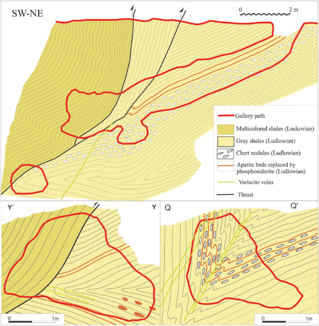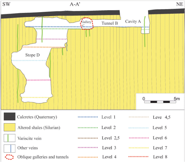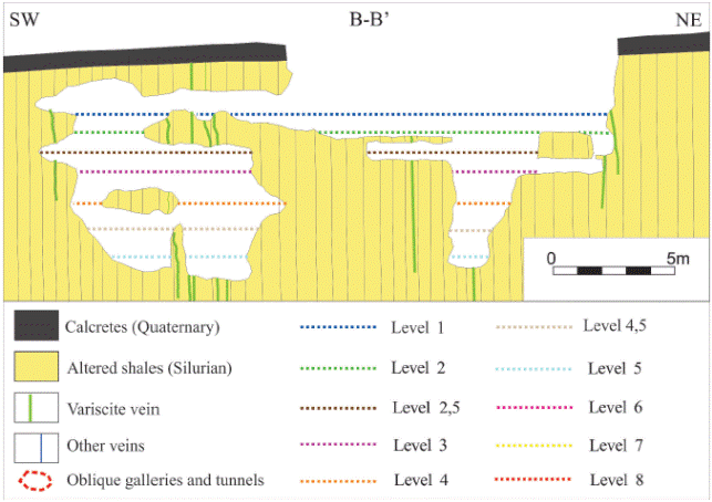 The prolongation of gallery D towards the SW changes slightly in direction following strengite and ochreous jarosite veins and then gives access to a large closed tunnel (labeled B in Figure 6). This cavity achieves the deepest point in the mine (15 m). It follows numerous subvertical variscite veinlets that strike E-W and N-S,being the top of the cavities about 2 to 3 m above stope D entrance (Figure 6). The veins follow all types of discontinuities, mainly the foliation of tight folds and joints, but in some cases the variscite mineralization can be strata-bound. Hence, there is a large density of phosphate veins in this sector, which are continuous for several meters. This arrangement allowed the miners to exploit these veins by an ensemble of parallel and perpendicular stopes separated by rock pillars (Figure 5).The B-Bʹ section (Figure 7), which is located in sector A, also shows types of exploitation that follow mineralized veins. At the NE part of this sector some galleries and pits were communicated only by small holes (10-20 cm in diameter), a space clearly unable to permit the passage of the miners. Some of the galleries were separated from other levels only by a few centimeters of rock, thus resulting in a high risk of collapse.