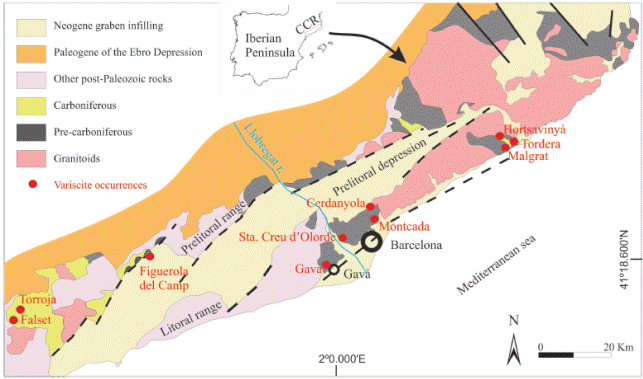 Edo, M., Blasco, A., Villalba, M.J., 1990, Approche de la carte de distribution de la variscite des Mines de Can Tintorer, Gavà (Catalogne): Cahiers du Quaternaire, 17, 287-298.