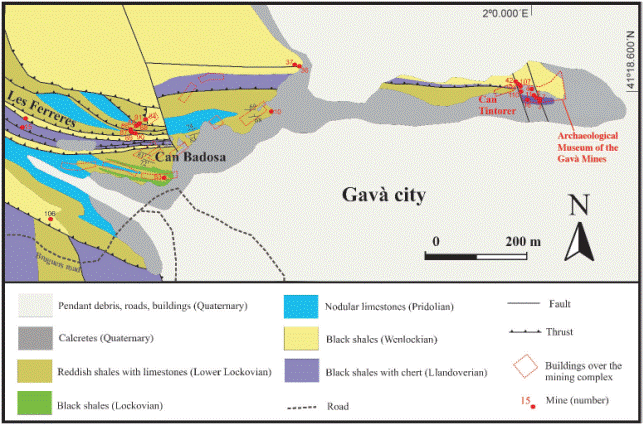 The geology of mines 1, 2, and 8 was already described in detail by Costa et al. (1994) and Camprubí et al. (2003). Therefore, the present work is focused on more recent archaeological excavations of the Neolithic mines. The mines have been developed in two different stages: (a) completion of the excavation of the galleries discovered in the 1970s, and (b) exploring new galleries that were discovered during new housing development in the Can Badosa-Les Ferreres area.