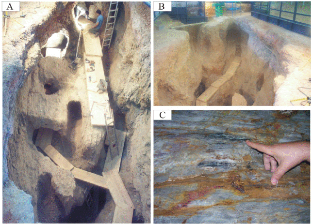 The large central cavity (labeled A in Figure 5) has an elliptical shape, is oriented roughly E-W, and is limited by vertical walls (3-5 m deep with respect to the present-day surface). The original surface of the cavity walls was clearly covered by Quaternary calcrete. Some walls show evidence of having been developed after older vertical shafts. This cavity is connected to several shafts open in the vicinity by tunnels underground; however, most of the galleries, trenches, and shafts appear to be developed from the cavity A.