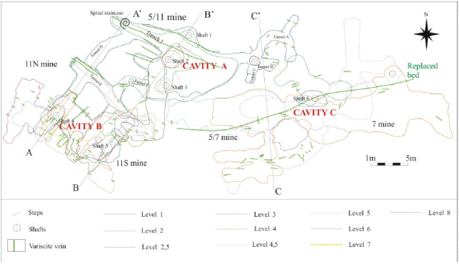 In order to better describe the system of exploitation, we have divided the mine in different cavities (Figure 5). Cavity A contains high-quality greenish-blue variscite in vertical veinlets that roughly strike E-W. The distribution pattern of the veinlets rules the exploitations geometry. The variscite veinlets usually range between 2 mm and 1 cm, and can be up to 3 cm thick, which provide large enough fragments to be crafted as beads. Relatively thick and continuous veins occur in trench 1 and in some shaft walls, especially the shaft 1, which is crosscut by the main cavity. Some of these veins were tracked by galleries and stopes in the underlying levels and are accessed through 1.5 to 3 m long vertical shafts. In addition, some short exploration tunnels start from the main cavity and follow thin vertical green variscite veinlets, as in the case of the tunnels A, B, C, and D (Figure 5). Tunnel A constitutes the uppermost level in the mine, but it would be unlikely older than cavity A. In tunnel A, itis possible to distinguish associated exploration galleries crossing in different directions and aiming at several vertical veins containing greenish clay minerals that resemble variscite. However, such clay minerals are too soft to be used to produce ornaments and therefore these galleries were abandoned.