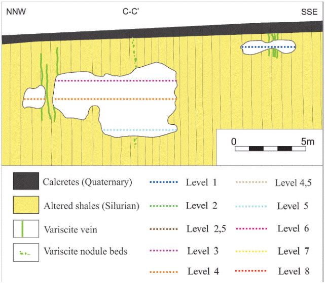 However, in some cases, mines were also initiated in the unconformably overlying calcretes, those are harder and more compact than the Silurian shales. The shafts opened in calcretes would have protected the intricate mine works and also would have stabilized the mine entrance.