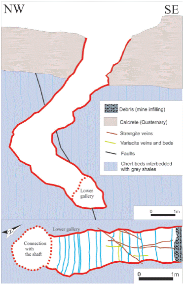 In addition, shafts and ramps that were dug on the hard Quaternary cover suggest that some of the mines were opened just following a mineralized outcrop. A possible explanation for such features, especially in complex mines that have not been completely excavated so far, could be that their original access entrance has not yet been discovered. According to this hypothesis, the original entrance could have been opened following a variscite outcrop, and the shafts would have been opened from the inside of the mine to the outside in order to create a ventilation system or emergency exit, or for fast transfer to the surface of extracted material. Nevertheless, some shafts have no communication whatsoever with any galleries, as is the case of mines 4 and 16. Consequently, it is likely that the Neolithic miners eventually understood that veins occur underneath the barren calcrete.