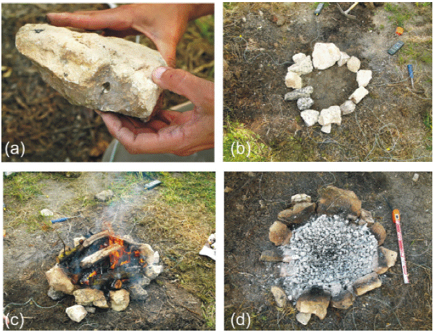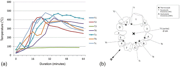 The experimental burning was carried out in early summer 2013 at Celadilla-Sotobrín, Burgos, Spain (42° 27′ N Lat., 3° 43′ W Long.). In order to monitor the temperature variations with time, a K-type thermocouple system was carefully located on the most external part of selected blocks of both types of limestones which were circularly distributed (Figure 1a to 1d) . An additional thermocouple (T3) was located in the substrate of the center of the hearth just for control. Wood fuel (cf. Quercus ilex) was used during burning and temperature readings were taken every five minutes during one hour. The highest temperatures recorded by the different themocouples varied between 400 and 450 ºC as is shown in Figure 2a and 2b). Thermocouple T3 (central part of the hearth) only reached 100 ºC because it was located at 2 cm of depth of the substrate. The very humid conditions of the substrate before burning together with the isolating effect generated by the ashes once they cover the surface avoiding heat penetration with depth, also explain why T3´s temperatures are strikingly low. Anyway, this is irrelevant for the goal of the study because the important temperatures are those specifically referred to the limestones blocks (Figure 2a and 2b).