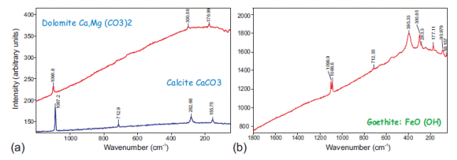 Rock-magnetic experiments carried out on pre-burning pilot samples indicate the coexistence of magnetite (determined from the thermomagnetic curves with Curie temperatures, (TC ~ 580 ºC) with a high-coercivity phase which in the IRM acquisition curves (not shown here) does not reach saturation at fields of 1 T (haematite and/or goethite). Raman analyses indicate that both types of limestones are mostly composed of calcite and dolomite, and also show that the high-coercivity ferromagnetic phase is goethite (Figure 3a and 3b).