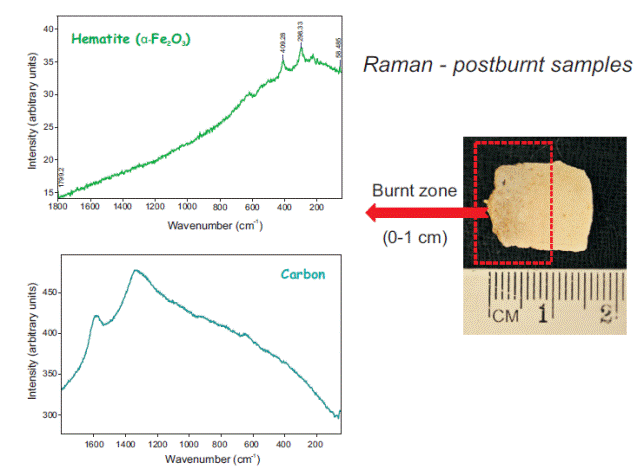 The magnetic properties of post-burning samples are related to the thermal impact suffered regardless of the type of limestone analyzed. Archaeomagnetic data indicate that goethite is still present in several outer specimens (0−2 cm). The low magnetization intensity values, the hardness upon AF demagnetisation (e.g. Figure 4a) and particularly the loss of up to 80-90% of the NRM after the 100 - 120ºC thermal demagnetisation step is clearly indicative of this (e.g. Figure 4b). The survival of this phase has also been confirmed by Raman analyses in the “fresh zone” (1-1.5 cm depth) on various post-burning samples (Figure 5). This result indicates that the heating experienced by some of these limestones was not sufficient to transform the goethite originally present. Nevertheless, the dominant iron oxide identified with Raman spectroscopy in the outermost zone (0 - 1 cm depth) on both types of limestones after heating was haematite (figures 5 and 6). This would explain the characteristic reddish colour observed in many samples which gradually dissipated with depth. Another major compound identified with Raman spectroscopy in the post-burning limestones was carbon, which was responsible for the dark colours (Figure 6). As far as the mineral magnetic analyses are concerned, the main magnetic carrier identified in the post-burning samples was magnetite. This has been particularly observed in the thermomagnetic curves with TC near to 580ºC but also in many NRM orthogonal demagnetisation diagrams (Figure 4c to 4g). Haematite, however, was not clearly identified with rock-magnetic analyses because its concentration was much lower than that of magnetite. Considering that magnetite is around 200 times more magnetic than haematite (Evans and Heller, 2003), haematite´s magnetic signal is completely masked by magnetite. Moreover, haematite formed from the dehydration of goethite is generally superparamagnetic and does not carry remanence (Dunlop and Özdemir, 1997). This is why magnetic analyses failed to detect it conversely to Raman spectroscopy. The interesting fact from the methodological point of view is that these results show the complementarity of both methods in the mineralogical characterization of these samples.