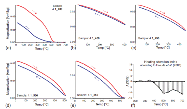 Additionally, progressive incremental partial thermomagnetic curves were performed on representative samples from both types of limestones in order to estimate the temperatures studying their reversibility. This information might be useful to correlate with the thermocouples’ readings to have an additional check of temperatures. The approach basically is the same to that proposed by Hrouda et al. (2003), who used progressive susceptibility versus temperature measurements as palaeotemperature indicator quantifying magnetomineralogical changes induced during laboratory heating. This alteration can be estimated as A30 = 100 (j30 - J30)/J30, where j30 and J30 are the magnetisation on the cooling and heating curves at 30 ºC, respectively (Hrouda et al., 2003). These analyses were carried out on powdered sample (~ 450 mg) from both types of limestones in 50 ºC incremental steps from 200 to 700 ºC.