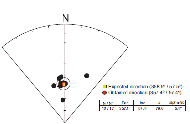 An archaeomagnetic study was carried out in order to assess the suitability of these limestones to record the Earth’s magnetic field (EMF) direction under similar burning conditions (1 hour and maximum temperatures of ~ 450ºC). This information combined with rock-magnetic and Raman spectroscopy data is very useful to obtain a pattern potentially applicable to the archaeological limestones in upcoming campaings. As the EMF direction for the time and place of burning is known (Dec: 358.5º/Inc.: 57.5º; according to the International Geomagnetic Reference Field, IGRF-11), it is worth studying how efficiently these limestones recorded it as well as if they generated distinctive properties with respect to their unburnt counterparts.