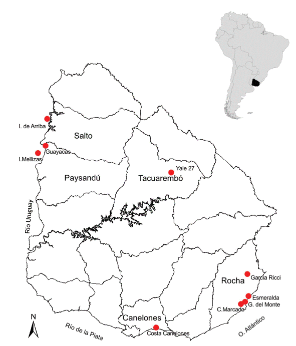 El área de estudio comprende diferentes sitios arqueológicos localizados en cinco departamentos del Uruguay (Figura 1). Dos de estos sitios, Guayacas (en un tope de lomada) e Isla mellizas (en el río Uruguay) se ubican en el departamento de Paysandú. Este departamento se encuentra en el litoral oriental del río Uruguay, al igual que el departamento de Salto, donde se ubica el sitio Isla de Arriba. En el departamento de Tacuarembó, ubicado en el centro-norte del territorio, se encuentra el sitio Lemos, en donde se encuentra la estructura monticular Yale 27. Otros cuatro sitios se encuentran en el departamento de Rocha, ubicado al sur-este de Uruguay. Tres de estos sitios (Cráneo Marcado, Guardia del Monte y García Ricci) se caracterizan por la presencia de cerritos de indios y el otro (La Esmeralda) está conformado por acumulaciones de material biogénico (concheros) y materiales superficiales en los espacios interdunares. En el departamento de Canelones el material se encuentra en la costa de confluencia del Río de la Plata y el océano Atlántico.