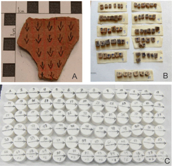 De los sitios mencionados (=9) se analizaron 16 fragmentos de cerámica. Cuatro de los fragmentos muestreados son del departamento de Paysandú (tiestos 7, 12, Gy0633 y Gy04042), uno de Salto (tiesto 5611), tres de Tacuarembó (tiestos 47, 9 y 29), siete de Rocha (tiestos 8, 11, CM01, CM03, 5, CO08 y CO13) y uno de Canelones (tiesto 10). Estos fragmentos fueron muestreados mediante su seccionamiento en cuadros de ~1cm × 1cm, obteniendo entre 6 y 7 especímenes de cada uno. Los especímenes así obtenidos fueron prensados en pastillas cilíndricas de sal con dimensiones similares a las de las muestras paleomagnéticas estándares para facilitar su tratamiento (Figura 2).