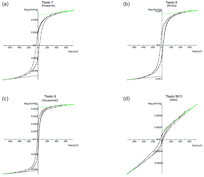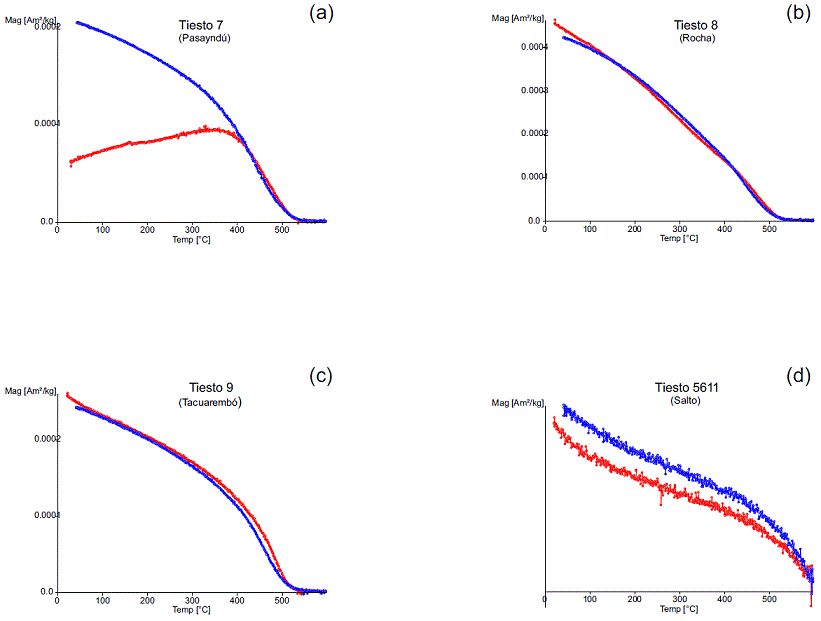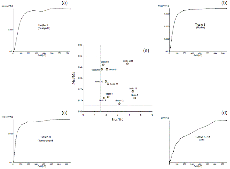 La forma de las curvas de histéresis es predominantemente del tipo pot-bellied (Figura 3a a 3c), con diferente contribución paramagnética. No obstante, la curva correspondiente al tiesto 5611 pertenece al tipo wasp-waisted (Figura 3d). La coercitividad (Bc) varía entre los 4.5 y 40.0 mT, mientras que la coercituvidad de remanencia (Bcr) entre los 11.3 y 154.6 mT. Por su parte, la magnetización de saturación (Ms) varía entre 7.0 × 10-6 y 9.7 × 10-4 Am/kg, mientras que la magnetización de saturación de remanencia (Mrs) entre 3.0 × 10-6 y 3.5 × 10-4 Am/kg. Todas las muestras alcanzan la saturación en campos alrededor de los 200-300 mT (Figura 4a a 4c), con excepción de la muestra tiesto 5611, que lo hace hasta ~ los 600 mT (Figura 4d), sugiriendo en esta última la presencia de un mineral magnético de alta coercitividad, como la hematita. La localización de la mayoría de las muestras dentro del diagrama de Day se encuentra básicamente en la región de los dominios pseudo simples (PSD) (Figura 4e), con excepción de los tiestos 7 y 13. Las curvas termomagnéticas son bastante reversibles, excepto para el tiesto 7, presentando una fase ferrimagnética compatible con titanomagnetita pobre en Ti (Figura 5a a 5c). En caso del tiesto 5611 (Figura 5d), su temperatura de Curie (Tc) es mayor a los 600 °C, lo que podría sugerir la presencia de hematita.